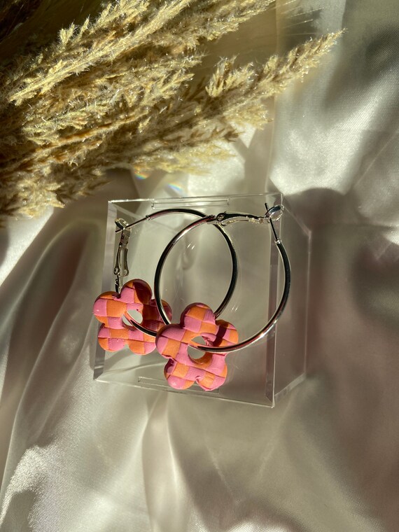 Pink And Orange Checkered Flower Hoop Earrings Etsy Australia